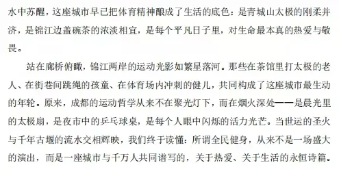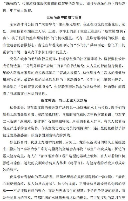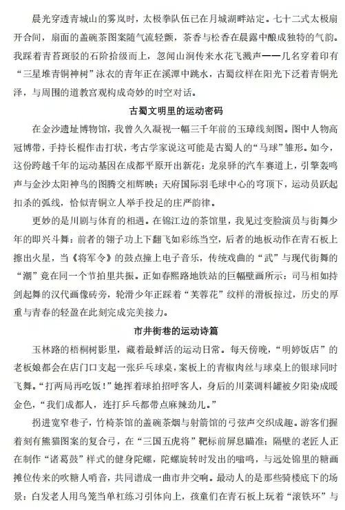 由四川省体育局主办,四川省体育博物馆承办,四川日报联合推出的2025年四川省“我的健身故事”全民健身有奖征集活动圆满结束,本次活动以“与世运同心,与全运同行”为主题,通过多样化的形式讲述全民健身故事,生动展现四川人民积极向上、奋勇拼搏的精神风貌,并创新征集模式,采用“社会+校园”双轨征集,参赛类别首次扩展至文学、书画、摄影、短视频、体艺类等五大板块。现将优秀作品进行展示,供广大读者欣赏。